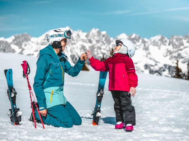 The Scheffau Ski School offers families and children a lovingly designed learning environment right on the mountain. At KinderKaiserland, located at the Scheffau gondola lift mountain station, even the youngest children from around 2 years of age can learn to ski in a playful way. For older children, teenagers, and adults, there are group courses and private lessons, including snowboarding.